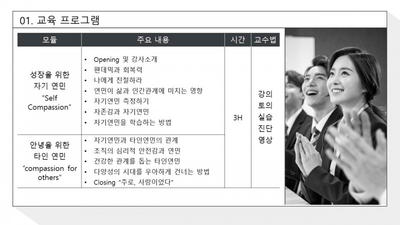 현재 고객접점과 공공부문, 기업에서는 연민문화 만들기 교육이 심도있게 진행중 입니다.